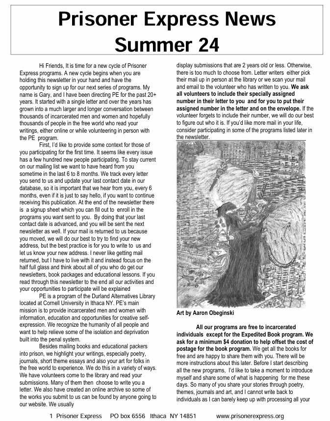 Our Summer 2024 Newsletter is now published and available for reading! This morning, we mailed out the latest Prisoner Express Newsletter to over 3,500 incarcerated people. Inside, you’ll find samples of their poetry, essays, and artwork, as well as notes from Prisoner Express staff and volunteers. Summer 2024 Prisoner Express Newsletter