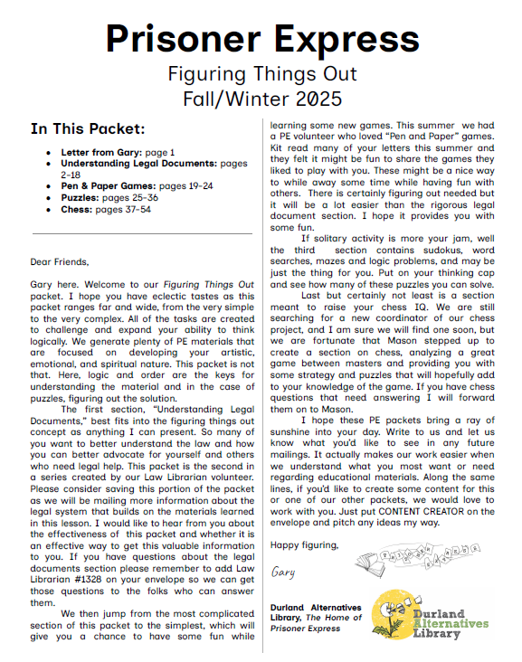 This part of our programming is the most flexible and is constantly changing. It allows an exciting opportunity for volunteers who want to take leadership on their own project and create something valuable. Those who subscribe to the Prisoner Express Newsletter hear about these new programs and then send back an enrollment form with their interests.
